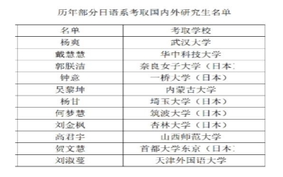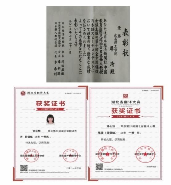 学生参与专业竞赛获得省级以上奖项50余项,包括学生廖琦在日本举办的全中国日语演讲比赛中,一路过关斩将,获得特等奖;学生许心怡连续两年在湖北省翻译大中获得一等奖等。此外,日语考级通过率一直处于较高水平,日语二级通过率保持在85%以上,一级通过率保持在65%左右,考研升学和出国留学率保持在20%左右。