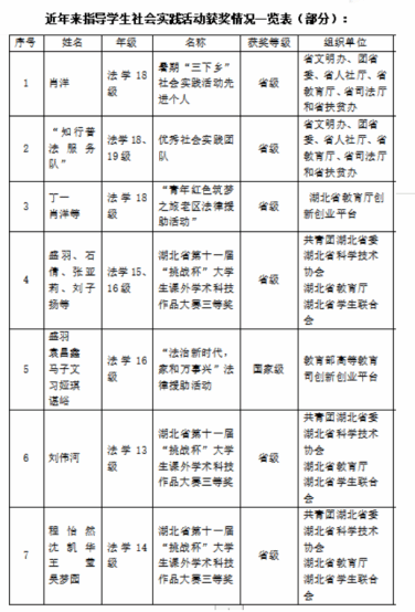 教学团队结合课程思政目标,融合革命老区精神、开展法律宣传调研、参与社会服务等,打造特色社会实践课程。组建“知行普法服务队”,五年来每年夏天前往湖北省乡镇村开展为期一个月的各类法律宣传和调研活动,持续多年开展的暑期社会实践活动三次获得团中央三下乡“千校千项”项目认定,其调研活动多次获得创新创业立项及各类获奖,社会实践课程改革取得较好成效,《红色之旅普法宣传社会实践》已于2021年获批成为省级一流本科课程,正在积极申报国家一流本科社会实践课程。