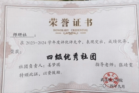 师研社在2023-2024学年度评优评先中,获得“四级优秀社团”