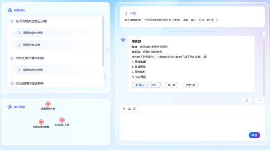 短语结构类型是学生后续学习单句和句法分析的关键基础,但也是容易混淆、练习容易枯燥的知识点。而“短语拆解局”巧妙地将传统练习升级为AI互动闯关任务:学生在拆解主谓、动宾、偏正等短语结构时,学习通AI实践系统可以实时判断正误并给出个性化训练题目,实现了“即练即评、即错即纠”。任务还设置了三维进阶分层关卡,难度递进,学生乐在其中。课堂上观察到,学生参与热情很高,完成进度和正确率在班级群中实时可见,形成了良性竞争氛围。