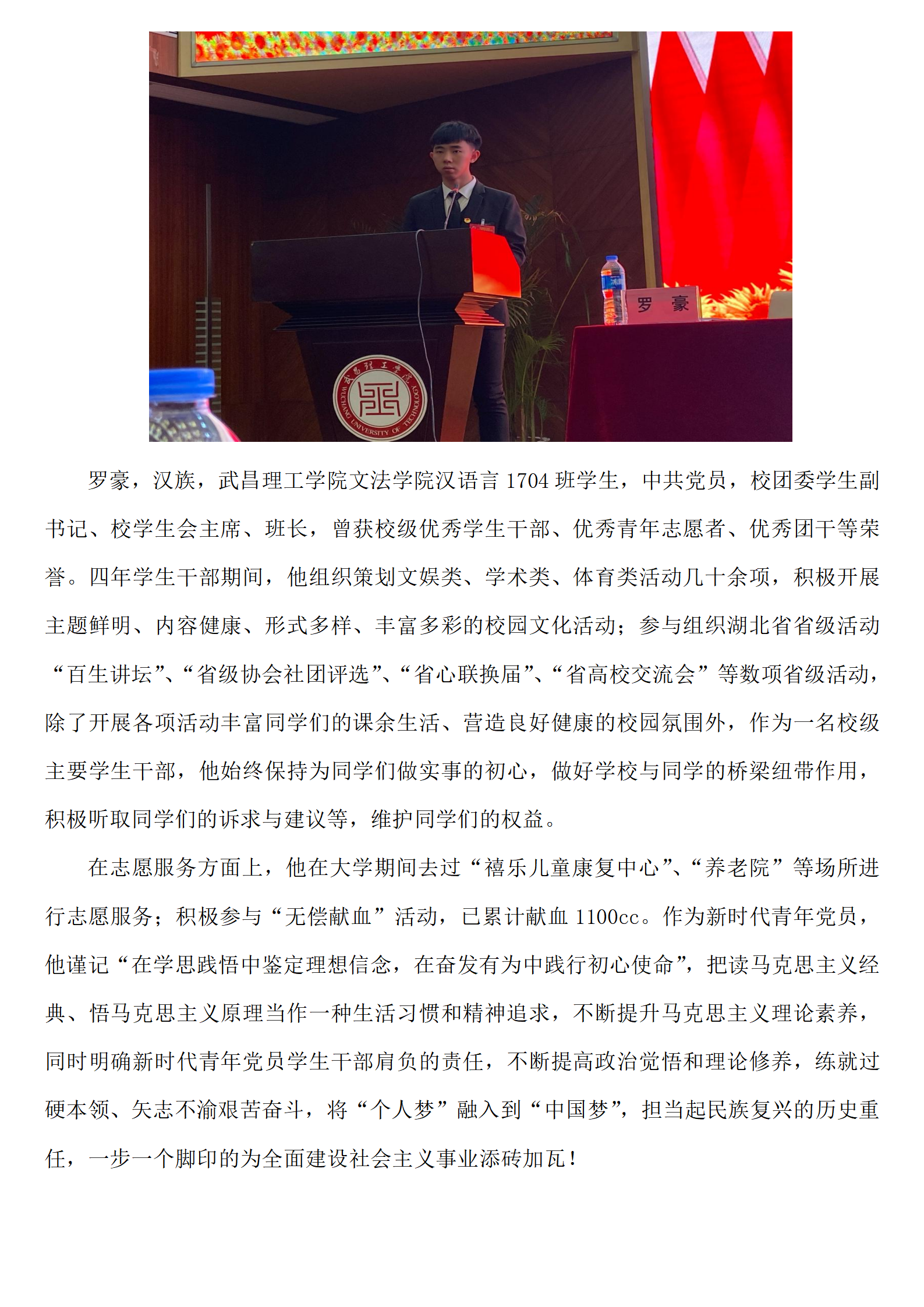 罗豪,汉族,太阳集团官网8722汉语言1704班学生,中共党员,校团委学生副书记、校学生会主席、班长。曾获校级优秀学生干部、优秀青年志愿者、优秀团干等荣誉。四年学生干部期间,他组织策划文娱类、学术类、体育类活动多达40余项,积极开展主题鲜明、内容健康、形式多样、丰富多彩的校园文化活动;组织并参与湖北省省级活动“百生讲坛”、“省级协会社团评选”、“省心联换届”、“省高校交流会”等数项省级活动。除了开展各项活动,丰富同学们的课余生活、营造良好健康的校园氛围外,作为一名校级主要学生干部,他始终保持为同学们做实事的初心,做好学校与同学的桥梁纽带作用,积极听取同学们的诉求与建议等,维护同学们的权益。