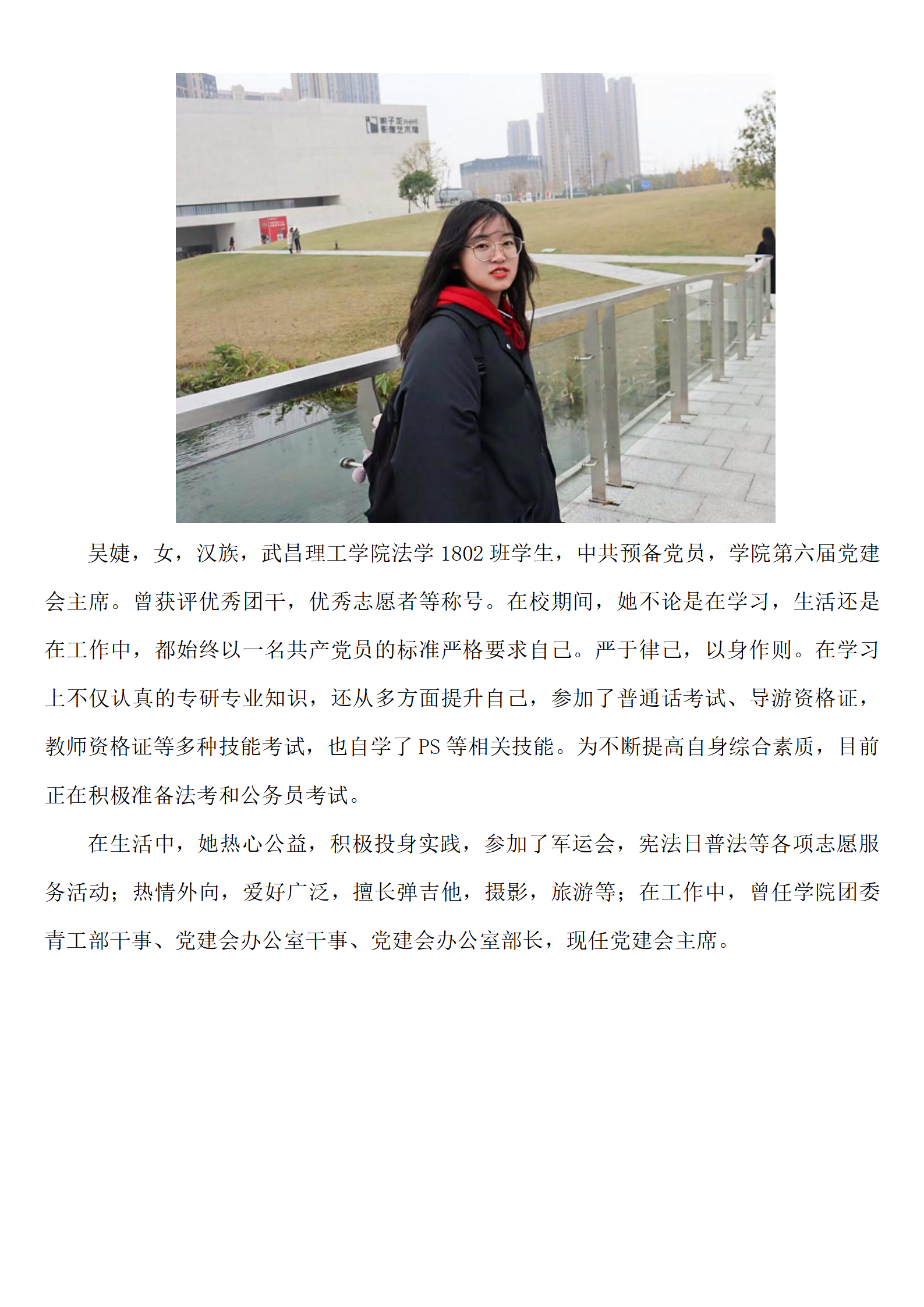 吴婕,女,汉族,太阳集团官网8722法学1802班学生,中共预备党员,学院第六届党建会主席。曾获评优秀团干,优秀志愿者等称号。在校期间,她不论是在学习,生活还是在工作中,都始终以一名共产党员的标准严格要求自己。严于律己,以身作则。在学习上不仅认真钻研专业知识,还从多方面提升自己,参加了普通话考试、导游资格证,教师资格证等技能考试。为不断提高自身综合素质,目前正在积极准备法考和公务员考试。在生活中,她热心公益,积极投身实践,参加了军运会,宪法日普法等各项志愿服务活动;热情外向,爱好广泛,擅长弹吉他,摄影等;在工作中,曾任学院团委青工部干事、党建会办公室干事、党建会办公室部长,现任党建会主席。