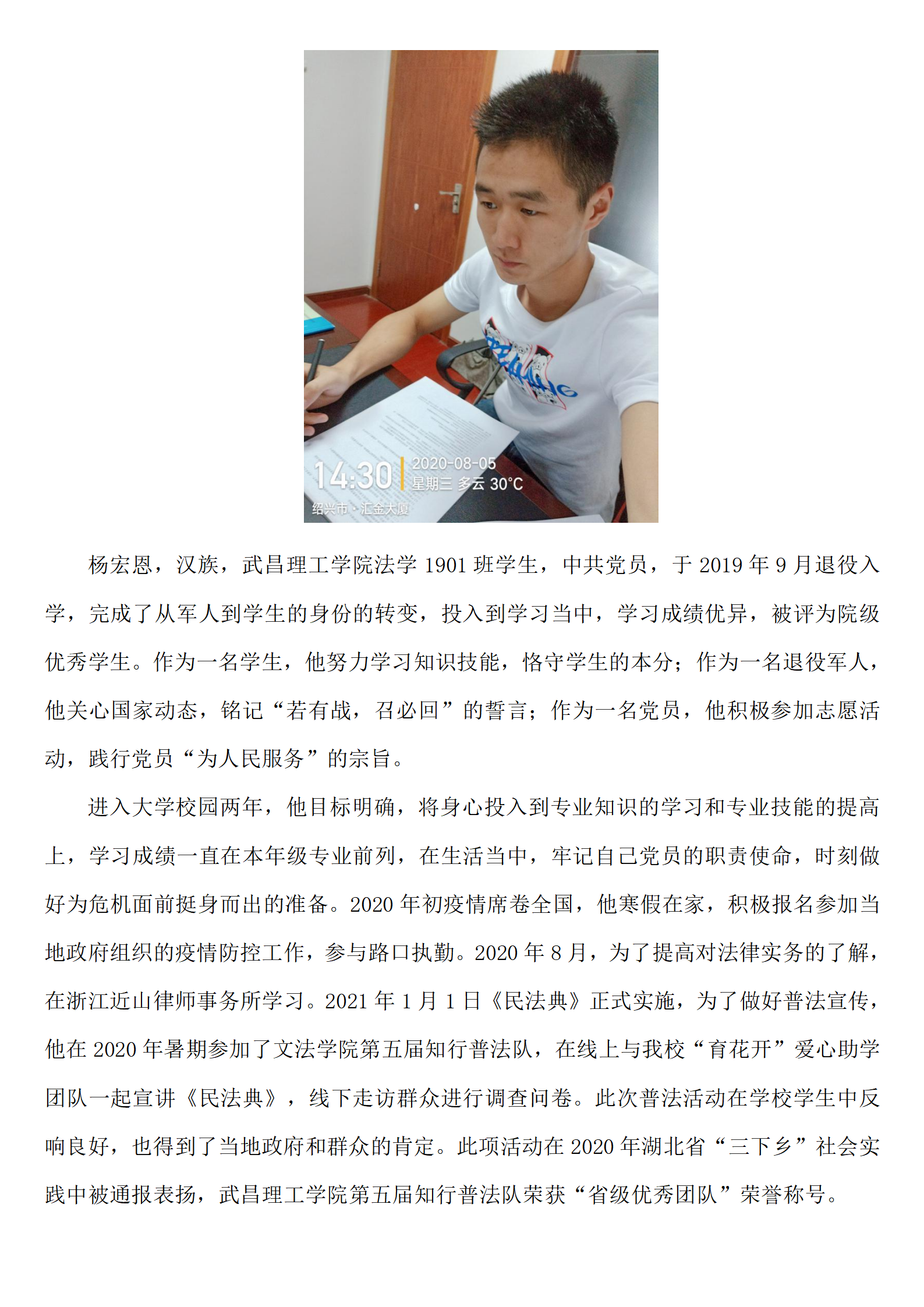 进入大学校园两年,他目标明确,将身心投入到专业知识的学习和专业技能的提高上,学习成绩一直在本年级专业前列,在生活当中,牢记自己党员的职责使命,时刻做好在危机面前挺身而出的准备。2020年初疫情席卷全国,他寒假在家,积极报名参加当地政府组织的疫情防控工作,参与路口执勤。2020年8月,为了提高对法律实务的了解,在浙江近山律师事务所学习。2021年1月1日《民法典》正式实施,为了做好普法宣传,他在2020年暑期参加了太阳集团官网8722第五届知行普法队,在线上与我校“育花开”爱心助学团队一起宣讲《民法典》,线下走访群众进行调查问卷。此次普法活动在学校学生中反响良好,也得到了当地政府和群众的肯定。此项活动在2020年湖北省“三下乡”社会实践中被通报表扬,太阳集团tcy8722第五届知行普法队荣获“省级优秀团队”荣誉称号。