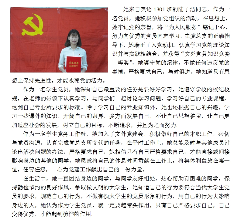 她知道只有思想上保持先进性,才能永葆党的活力。作为一名学生党员,她深知自己最重要的任务是要好好学习,她遵守学校的校纪校规,在老师的带领下认真学习,与同学们一起讨论学习问题,学习好自己的专业课程,达到自己专业所要求的标准。除了学习自己的专业知识外,她也还根据自己的兴趣,学习一些课外的知识,开阔自己的眼界,多方面发展自己,不让自己思想狭隘,让自己更加适应社会的发展,树立自己的目标,不断追求,并且为之而努力。作为一名学生党务工作者,她加入了党建会,积极做好自己的本职工作,密切与党员沟通,认真完成党总支所交代的任务,在平时工作上,她总能及时与其他成员讨论出解决问题的办法,严格要求自己,她相信只有自己严格要求自己,才能直接或间接影响身边的其他的同学,她愿意将自己的休息时间贡献在工作上,将集体利益放在第一位,任劳任怨,一心为党建工作献出自已的一份力量。