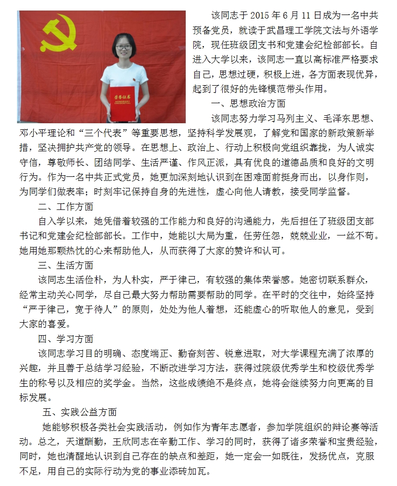 该同志努力学习和了解党和国家的新政策新举措,坚决拥护共产党的领导。在思想上、政治上、行动上积极向党组织靠拢,为人诚实守信,尊敬师长、团结同学生活严谨作风正派,具有优良的道德品质和良好的文明行为。作为一名中共正式党员,她更加深刻地认识到在困难面前挺身而出,以身作则,为同学们做表率;时刻牢记保持自身的先进性,虚心向他人请教,接受同学监督。自入学以来,她凭借着较强的工作能力和良好的沟通能力,先后担任了班级团支部书记和党建会纪检部部长。工作中,她能以大局为重,任劳任怨,兢兢业业,一丝不苟她用她那颗热忱的心来帮助他人,从而获得了大家的赞许和认可。该同志生活俭朴,为人朴实,严于律己,有较强的集体荣誉感。她密切联系群众,经常主动关心同学,尽自己最大努力帮助需要帮助的同学。