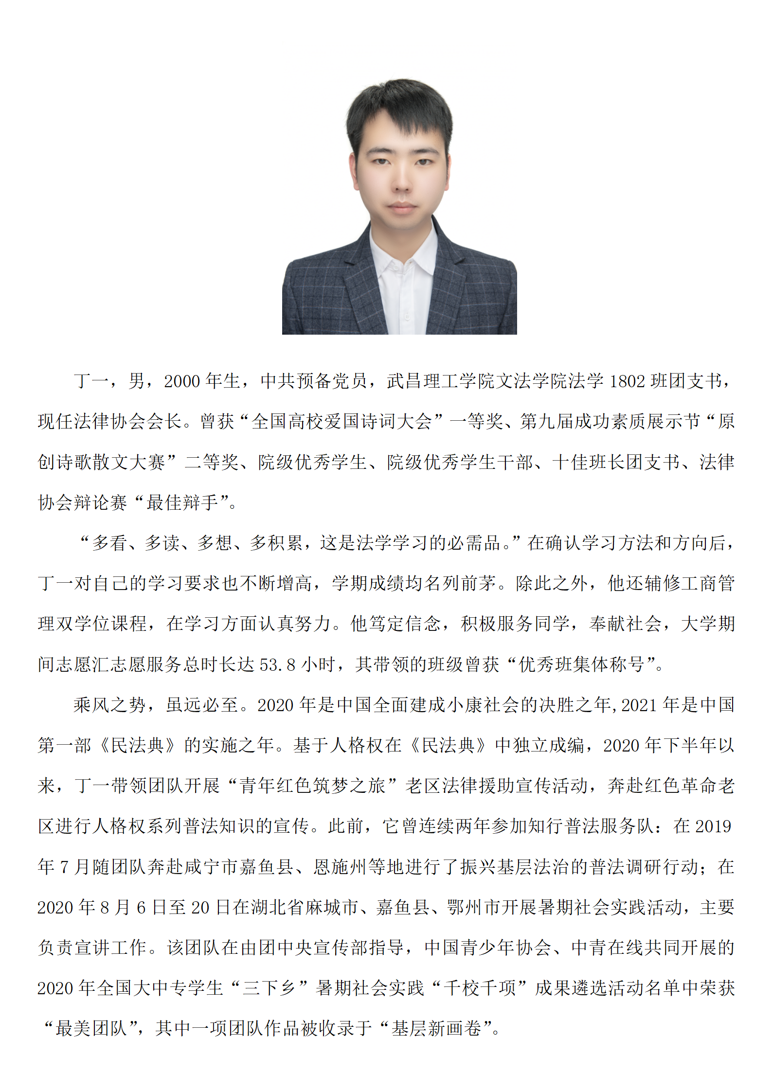 乘风之势,虽远必至。2020年是中国全面建成小康社会的决胜之年,2021年是中国第一部《民法典》的实施之年。基于人格权在《民法典》中独立成编,2020年以来,丁一带领团队开展“青年红色筑梦之旅”老区法律援助宣传活动,奔赴红色革命老区进行人格权系列普法知识的宣传。此前,他曾连续两年参加知行普法服务队:在2019年7月随团队奔赴咸宁市嘉鱼县、恩施州等地进行了振兴基层法治的普法调研行动;在2020年8月6日至20日在湖北省麻城市、嘉鱼县、鄂州市开展暑期社会实践活动,主要负责宣讲工作。该团队在由团中央宣传部指导,中国青少年协会、中青在线共同开展的2020年全国大中专学生“三下乡”暑期社会实践“千校千项”成果遴选活动名单中荣获“最美团队”,其中一项团队作品被收录于“基层新画卷”。