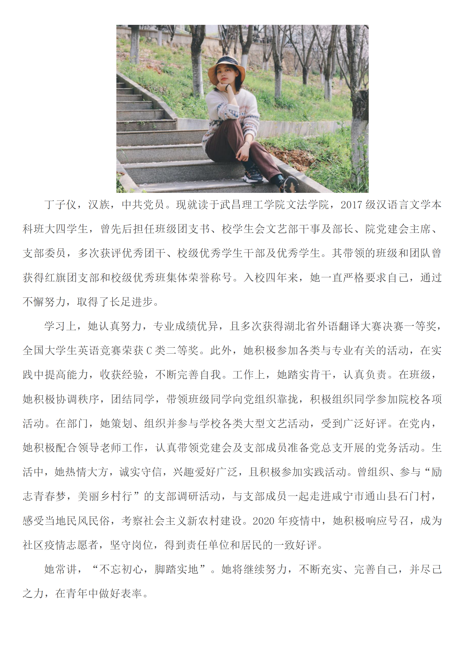 学习上,她认真努力,专业成绩优异,且多次获得湖北省外语翻译大赛决赛一等奖,全国大学生英语竞赛荣获C类二等奖。此外,她积极参加各类与专业有关的活动,在实践中提高能力,收获经验,不断完善自我。工作上,她踏实肯干,认真负责。在班级,她积极协调秩序,团结同学,带领班级同学向党组织靠拢,积极组织同学参加院校各项活动。在部门,她策划、组织并参与学校各类大型文艺活动,受到广泛好评。在党内,她积极配合领导老师工作,认真带领党建会及支部成员准备党总支开展的党务活动。生活中,她热情大方,诚实守信,兴趣爱好广泛,且积极参加实践活动。曾组织、参与“励志青春梦,美丽乡村行”的支部调研活动,与支部成员一起走进咸宁市通山县石门村,感受当地民风民俗,考察社会主义新农村建设。2020年疫情中,她积极响应号召,成为社区疫情志愿者,坚守岗位,得到责任单位和居民的一致好评。