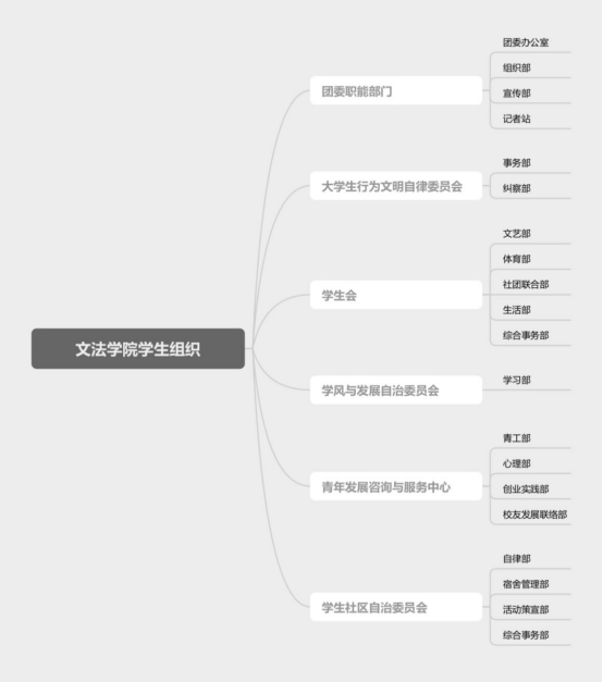 学生组织各部门按照1:2:6的比例配置人员,即一名部长、两名副部长、六名干事(部门可根据需要做适当调整),青工部设志愿者委员会,学习部设辩论队,体育部设篮球队,社团与外联部简称社联部,学生社区管理委员会简称宿管中心,社联部服务、管理学院英爵协会、影视制作协会、日语协会、法律协会、梅南文学社和中西方饮食交流协会等社团。