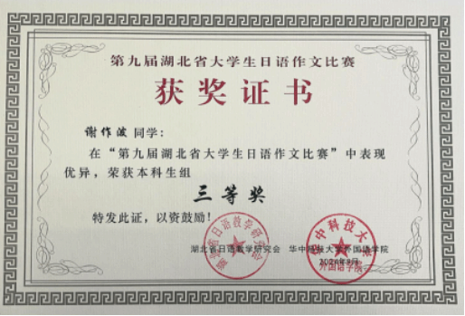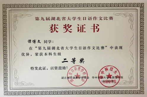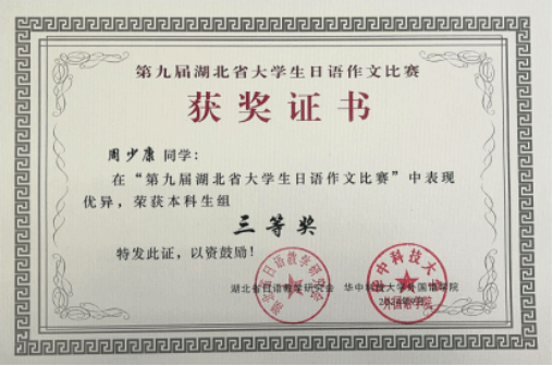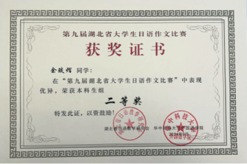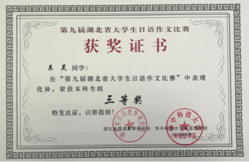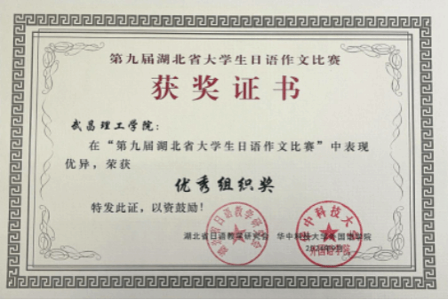 近日,在湖北省第九届大学生日语作文比赛中,我校日语专业学生取得了骄人的成绩,展现了卓越的学习成果和竞争实力。经过激烈角逐,我校日语学子表现优异,荣获多项殊荣。