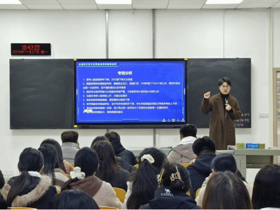 大会伊始,张园园老师作开场致辞。她鼓励在座同学坚定考研信念,并通过日积月累的扎实努力为考研之路奠定坚实基础。随后,张老师向同学们介绍了刘康与董雨辰两位资深教师,他们分别围绕专业分析与院校选择两大关键议题进行了深入讲解。