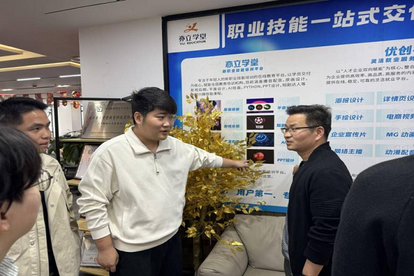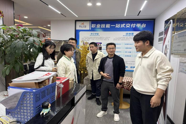 武汉亦立在线科技有限公司以教育咨询、招生辅助为核心业务,同步布局软件开发、互联网技术服务、广告策划等多元领域。走访中,在公司负责人郝志伟的陪同下,学院访团实地参观了企业技术研发中心、运营管理团队及业务展示区,深入了解企业“技术+教育”的核心运营模式。座谈会上,郝志伟详细介绍了公司发展概况。
